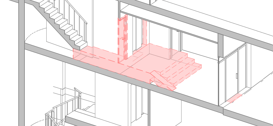 Este tipo de situación, aunque genera una barrera clara para los usuarios, puede resolverse con relativa sencillez si la configuración del edificio lo permite. En este caso, los escalones estaban ejecutados como recrecido sobre el forjado de planta baja, lo que facilitaba su derribo sin necesidad de alterar de manera importante la estructura principal del inmueble.